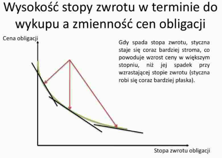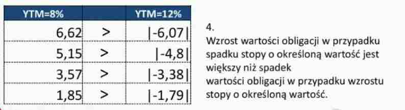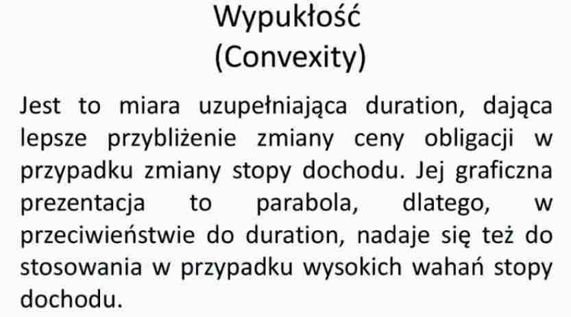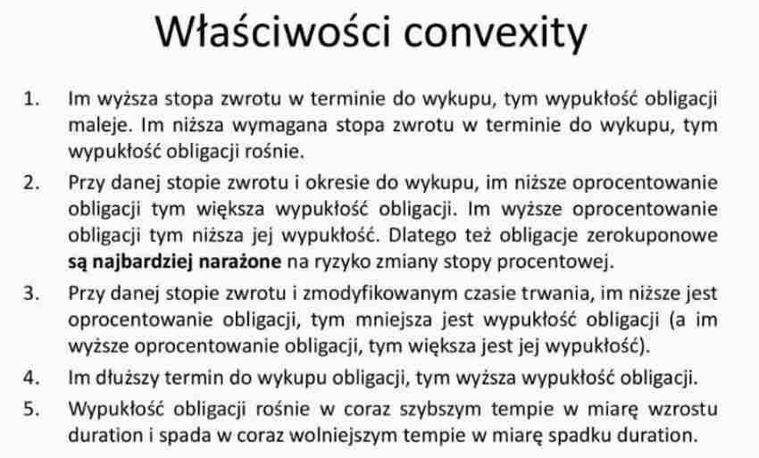 - Wypukłość (convexity) obligacji rośnie w coraz szybszym tempie w miarę wzrostu jej czasu trwania (duration) i spada w coraz wolniejszym tempie w miarę spadku jej czasu trwania (duration)