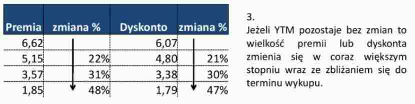 2. Jeśli stopa dochodu zostaje bez zmian to wraz ze zbliżaniem się do terminu wykupu zmniejsza się wartość premii lub dyskonta. Czyli im dłuższy termin do wykupu (przy danym %) tym większa jest zmienność cenowa obligacji