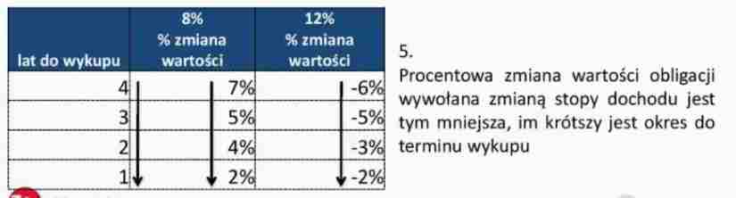 6. Procentowa zmiana wartości obligacji wywołana zmianą stopy dochodu jest tym mniejsza, im wyższe jest % obligacji, przy założeniu tego samego terminu wymagalności.